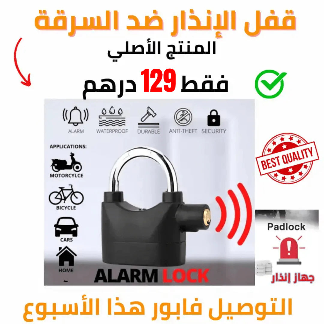 🔊 إنذار قوي: صوت عالي (أكثر من 110 ديسيبل) كيتشعل مباشرة فحالة محاولة فتح القفل أو كسره.
